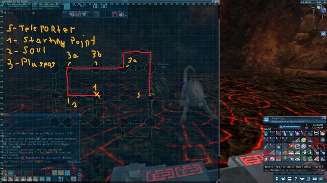 In this small cavern alcove that had opened is a Wandering Soul, you must talk to it and chose option 2, then "Yes". Afterwards go back the way you came to the place I designated with the number 3, starting with the 3a first, you'll see a red plasma there, activate it and it will spawn either Herald Mou Ryo, Herald Blob, Herald Will'O Wisp or Herald Bai Ze.(Which oddly has the same spawn chance of 3% as the Shitbird and consequently the plug itself, even though they don't seem to be related in anyway)