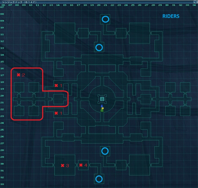 When you kill enemies at the marked rooms 1, 2, 3 and 4 of B14F (see the map below), the doors at 20/32 & 20/13 can be opened and one rider randomly appears. The other two doors at 21/28 & 21/9 open if you clear the east side of the map just the same as on the west side.