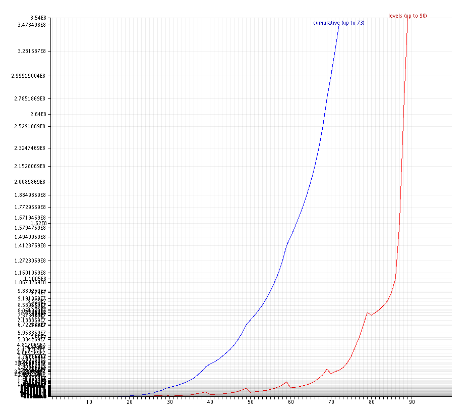 After every 10 levels the effort needed to get the next level decreases somewhat.